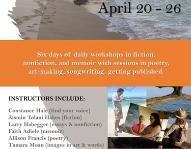 I’ll be teaching Breath & Water: Memoir and Personal Essay, a weeklong workshop in April! There will also be Yoga, Songwriting, Poetry, Art, and Cultural Excursions. REGISTER HERE - EARLY BIRD PRICING ENDS JAN 31!